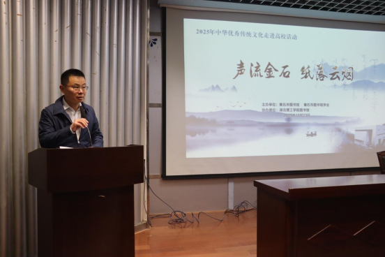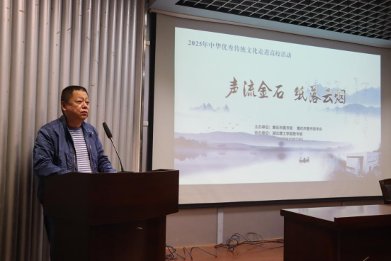 本网消息 10月23日下午,“声流金石 纸落云烟”——黄石市图书馆“中华优秀传统文化走进高校”活动在Beat365官网图书馆T2报告厅举办。本次活动由黄石市图书馆主办,Beat365中文官方网站图书馆协办,旨在深入贯彻党的二十大精神和习近平总书记关于中华优秀传统文化重要论述精神,更好发挥古籍在传承和弘扬中华优秀传统文化中的独特作用,让尘封历史的古籍重焕新生,让更多人感受传统文化的魅力。文化志愿者、资深讲书人杨剑波老师受邀担任主讲人。黄石市图书馆馆长王健、黄石市图书馆学会秘书长王朝霞、Beat365中文官方网站党委宣传部常务副部长王定兴、图书馆馆长钟松、图书馆副馆长刘涛、师范学院教授舒韶雄及师生代表参加活动。
