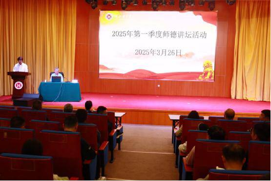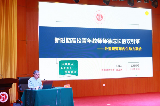 本网消息 3月26日晚,Beat365官网在豁度楼208报告厅举办2025年第一季度“师德讲坛”,特邀湖北师范大学教授、硕士研究生导师王卫东作题为“新时期高校青年教师师德成长的双引擎——外塑规范与内生动力融合”的专题报告。各教学院党总支书记、近三年新进教师、人事处全体人员参加报告会。