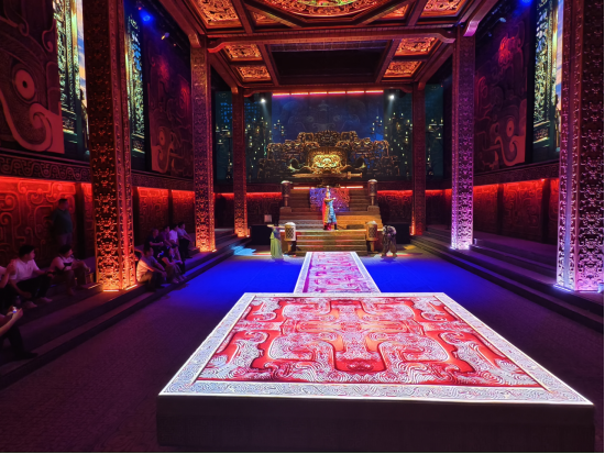 活动中,党员们集体观看了国内首部博物馆沉浸式舞台剧《因为青铜》。该剧以青铜文化为主题,讲述了先秦时期民女楚叶冒死劝谏楚王“铸剑为犁”、化战争武器为和平礼器的动人故事。通过光影投影、互动式剧情演绎,党员们仿佛穿越回两千年前的楚国,目睹楚王在铜绿山大兴炉冶的盛况,感受古代矿工在严苛工期下的艰难抉择与智慧抗争。