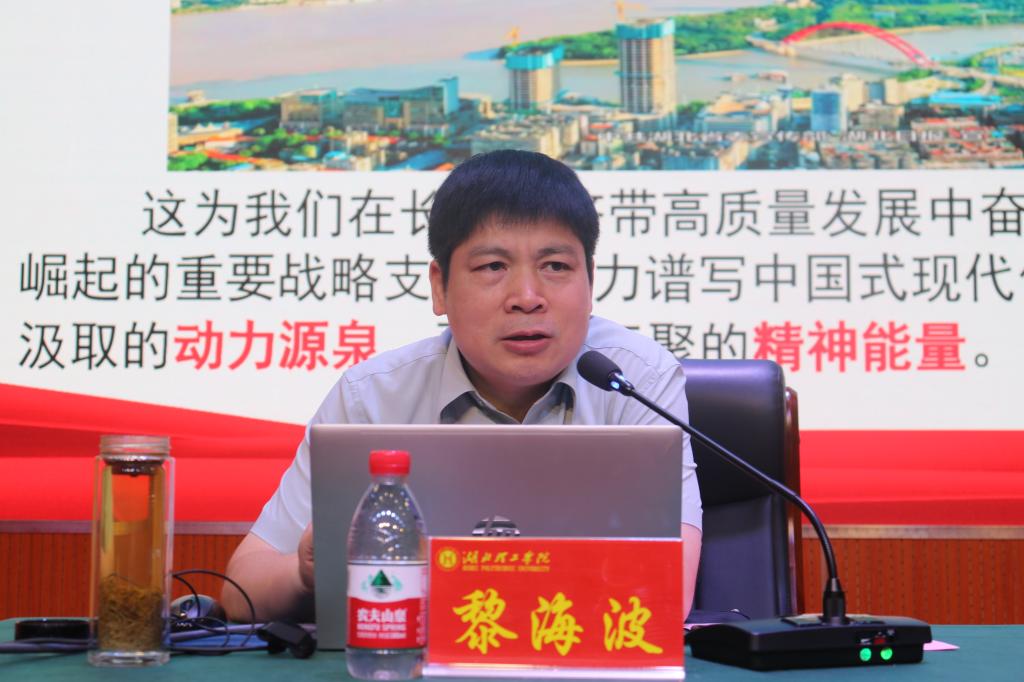 黎海波教授以“弘扬‘三大精神’,为‘支点建设’凝聚强大精神力量”为题,围绕“中国共产党人精神谱系的湖北标识”“‘哲学三问’与‘三大精神’”等内容,深入浅出、旁征博引,以深厚理论功底和丰富案例,深刻阐释了“三大精神”的内涵实质、时代价值与实践要求。黎海波教授表示,重溯“伟大精神”,正是“用历史映照现实、远观未来”,从伟大精神中汲取不竭力量,向第二个百年奋斗目标迈进,这是国之所需,也是吾辈之责。愿以吾辈之青春,捍卫这盛世之中华,大力弘扬大别山精神、抗洪精神、抗疫精神,汇聚“奋勇争先、建成支点、谱写新篇”强大合力。