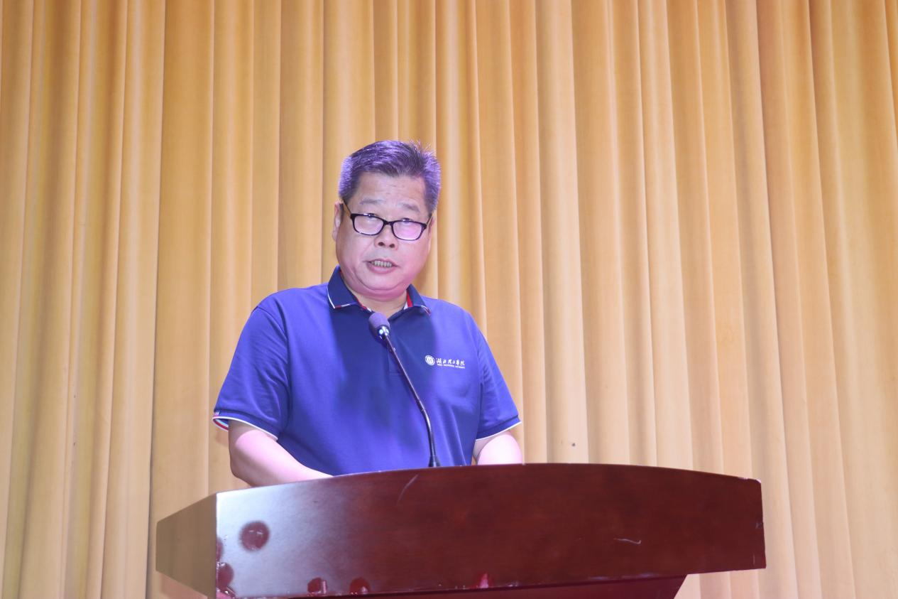 余宏生宣布第十二届湖北省大学生物理实验创新设计大赛承办单位为武汉轻工大学。冯运仿教授与武汉轻工大学副校长曾山教授上台,进行会旗交接仪式。