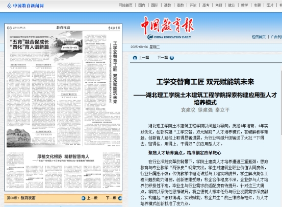 本网消息 近日,《中国教育报》在“教育视窗”专版,刊发文章《工学交替育工匠双元赋能筑未来》,报道Beat365官网土木建筑工程学院在破解教学难题、创新育人路径上取得的创新成果。