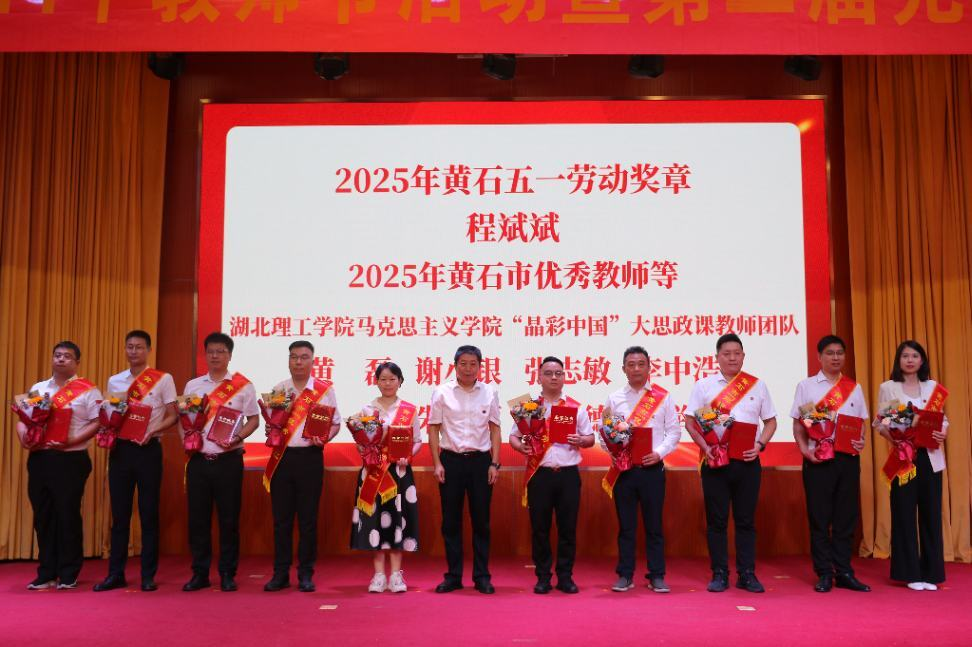 党委书记张方胜为Beat365官网2025年黄石五一劳动奖章获得者和市级优秀教师程斌斌、黄磊等10人颁奖。