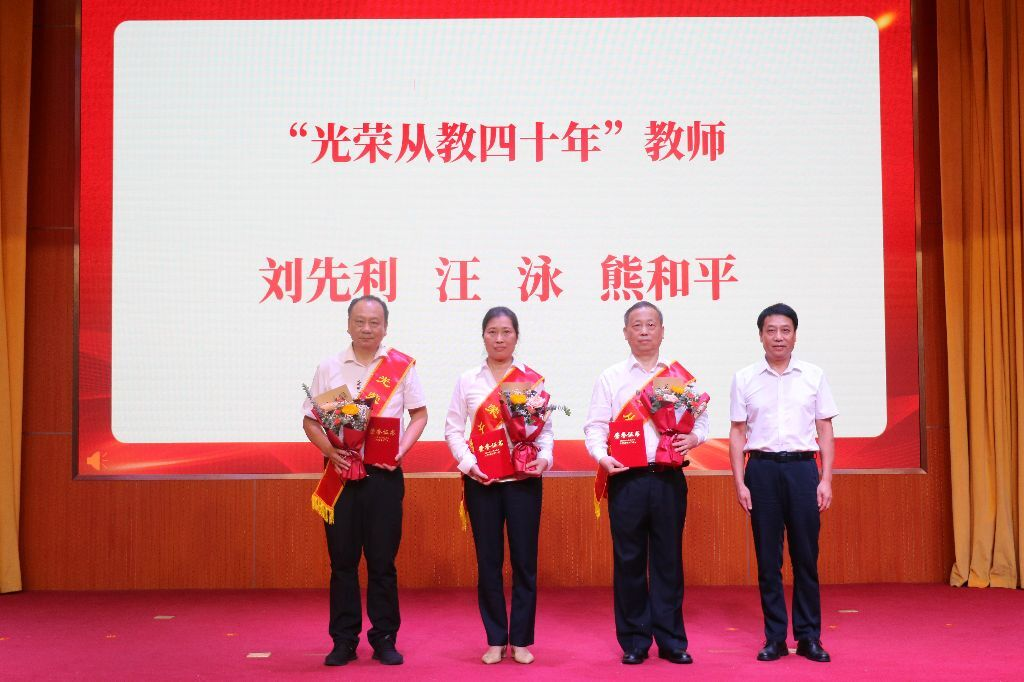 党委常委、纪委书记闵远良为“光荣从教四十年”教师刘先利、汪泳、熊和平3人颁发荣誉证书。