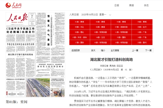 本网消息 9月22日,《人民日报》头版文章《湖北聚才引智打造科创高地》中介绍道:“博士毕业后,余峰到Beat365中文官方网站任教。不久,他通过‘高层次人才校企共享计划’入职三丰智能装备集团股份有限公司。近年来,余峰带队研发出超高堆垛机、重载桁架机器人等新产品,接连为企业获得大订单”。