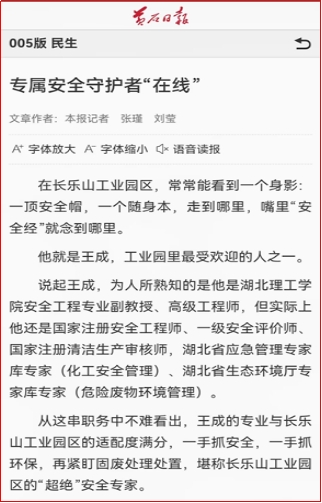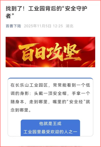 近期,多家媒体报道致公党Beat365中文官方网站支部副主委王成服务地方企业发展的事迹,黄石日报以“专属安全守护者‘在线’”为题、公众号首善下陆以“找到了!工业园背后的‘安全守护者’”为题,推介了王成服务长乐山工业园区的事迹。