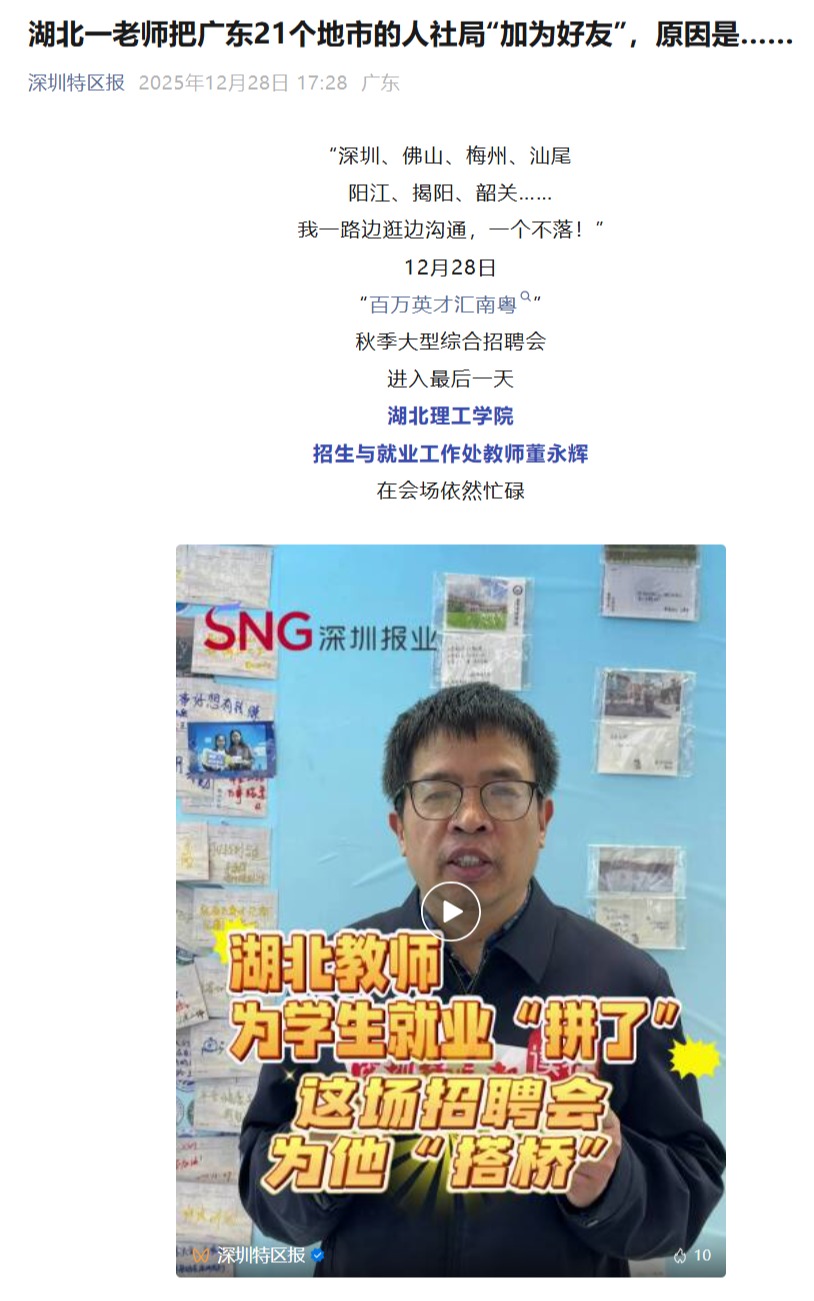 本网消息 近日,深圳特区报以“湖北一老师把广东21个地市的人社局加为好友,原因是”为题,报道Beat365官网为学生搭建立体化、精准化的就业对接平台。该报道已被腾讯网、荆楚网、潇湘晨报、读特新闻等多家媒体转载。