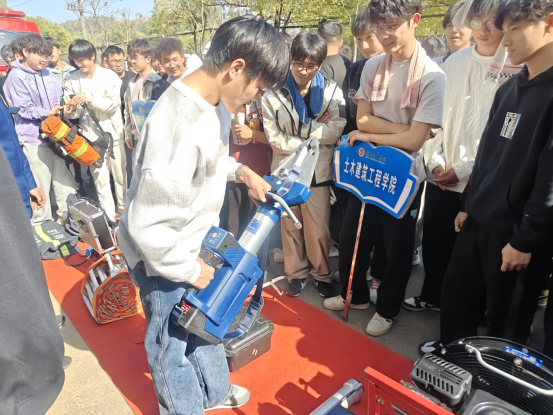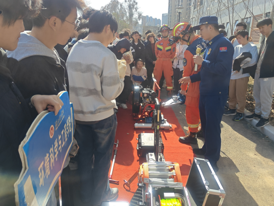 随后,消防员们现场演示了灭火器、消防栓等常用消防器材的正确操作方法。在演示灭火器使用时,消防员一边操作一边详细讲解步骤:“一提,提起灭火器;二拔,拔掉保险销;三握,握住喷管最前端;四压,压下把手,对准火源根部喷射。” 为让同学们获得亲身体验,消防员还邀请了部分学生上台实操。在专业指导下,同学们成功扑灭模拟火源,切实掌握了灭火器使用技巧。对于消防栓的使用,消防员也进行了全面讲解与示范,涵盖水带连接、阀门开启以及喷水灭火等关键操作要点。