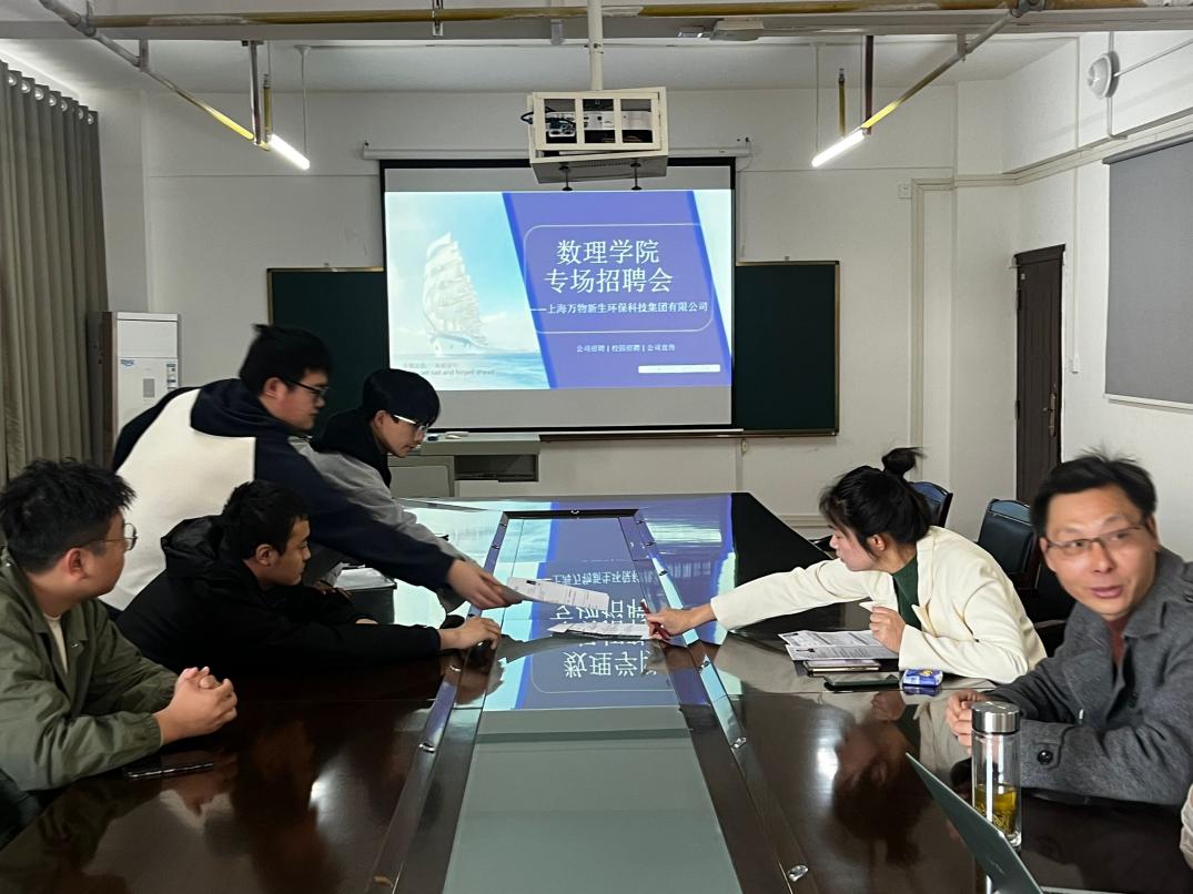 本网消息 3月21日上午,上海万物新生环保科技集团有限公司HR徐璐一行到数理学院三楼会议室举办专场招聘会。数理学院党总支书记陈君、副院长许小芳、辅导员王希金及数理学院部分2025届毕业生参加了此次招聘会。