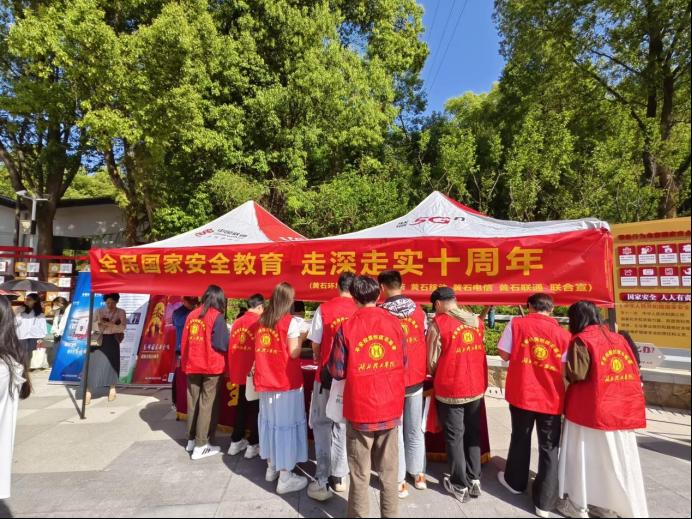 本网消息 为扎实提升师生校园安全防范意识,全面锤炼学生骨干在安全管理工作中的专业本领,4月15日,在校保卫处的悉心指导下,校园安全协会周密部署,精心组织 50 余名学生骨干,奔赴青龙山公园,参与由黄石市国家安全局主办的 “全民国家安全教育走深走实十周年” 主题宣教活动。
