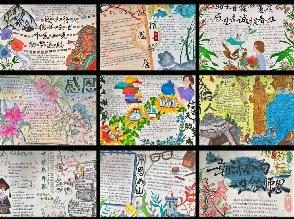 感恩实践环节更是将活动推向高潮。同学们积极参与“翰墨书师魂”书法征集和“诚信感师恩”手抄报创意大赛,将平日里难以言说的感激之情化作温暖的文字和图画,以墨香传递尊师感恩之情。