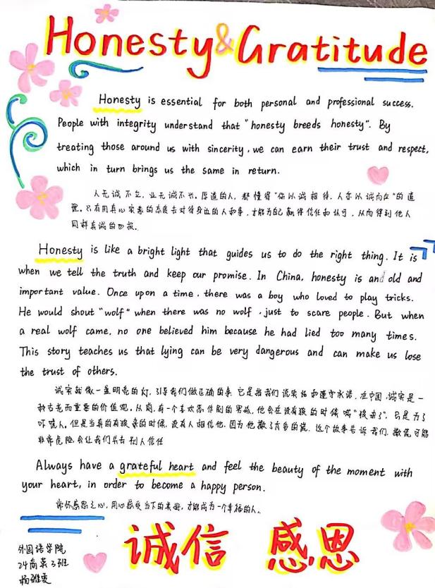 本网消息 为进一步发挥资助育人在立德树人根本任务中的关键作用,弘扬诚信感恩文化,外国语学院于3月—4月开展了“诚信为本、感恩有你”系列主题活动。活动立足英语学科特色,将诚信感恩教育与专业学习、文化传承、价值引领深度融合,推动资助政策精神浸润校园,激励外语学子践行诚信、传递感恩。