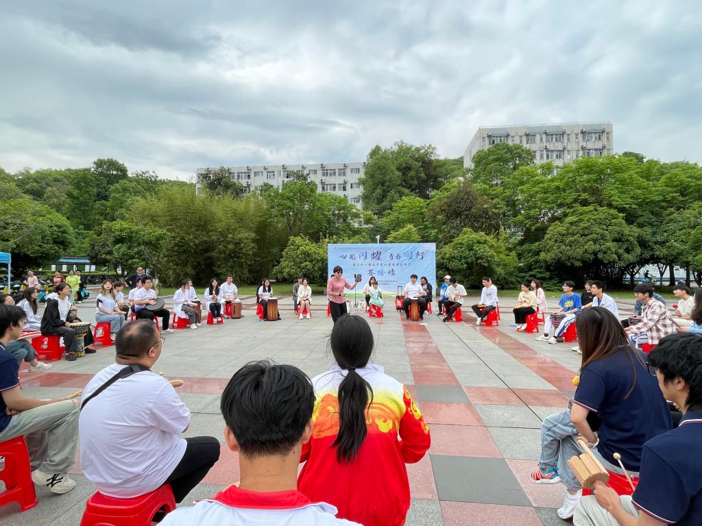 启动式由大学生心理健康教育中心专职教师杨雨婷主持。学工部副部长兼大学生心理健康教育中心主任查贝致开幕词开启本届宣传月的启动式,她强调:我们要以宣传月为契机,共同构建“全员心理育人”生态圈。教师要做学生心灵的“守夜人”,同学要当好彼此的“心灵伙伴”,每个人都要成为自己心理健康的第一责任人。大学生心理健康教育中心专职教师李芙蓉带领60名师生代表开展鼓圈韵律活动,在统一的节奏指挥下协作演奏,通过音乐传递情感产生共鸣。
