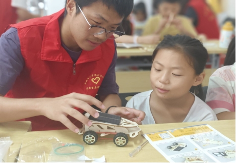 这群身着红马甲的理工学子,是课程的设计者,更是成长的陪伴者。他们将专业所长融入教学实践,既化身“安全导师”,用代码思维解析网络风险,又变身“文化使者”,让非遗技艺焕发新彩。课堂上是循循善诱的小老师,课间是并肩游戏的大朋友,他们以青春之力,让志愿服务既有温度,更显专业。