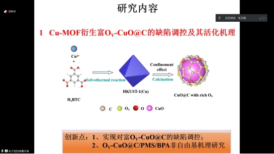 朱文君,毕业于武汉科技大学化学工程与技术专业,获工学博士学位。2023年进入黄石湖理环保节能产业技术研究院有限公司—博士后科研工作站,主要从事MOFs衍生金属氧化物修饰碳纳米复合物缺陷的调控及其氧化降解有机污染物机理等方面的研究工作。博士后研究课题为《MOFs衍生金属氧化物修饰碳纳米复合物缺陷的调控及其氧化机理的研究》,该研究结果在催化应用的缺陷工程方面取得了显著进展,特别关注于开发源自铜金属有机骨架(Cu-MOFs)的富含氧空位的CuO@C催化剂,用于过氧单硫酸(PMS)的活化。该研究展示了一种简便且可控的合成方法,并深入研究了氧空位介导的电子转移的协同效应,促进了以单线态氧生成为主的非自由基降解途径。在站期间,朱文君博士以第一作者发表SCI论文1篇,中文综述一篇,主持矿区环境污染控制与修复湖北省重点实验室联合开放基金、Beat365中文官方网站校级项目各1项。