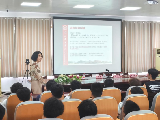 李莉围绕中外合作办学项目展开讲解,介绍其与美国梅里马克学院(波士顿附近)的合作背景、院校概况及优质师资,并重点阐述项目在美校申请、就业竞争力与考研率上的优势,帮助新生清晰认知所学专业与项目的核心价值。她提到,希望同学们能尽快适应校园生活,主动融入集体,在夯实知识基础的同时积极探索专业领域;既要培养独立思考能力,勇于参与创新实践,又要注重修身立德,实现全面发展。