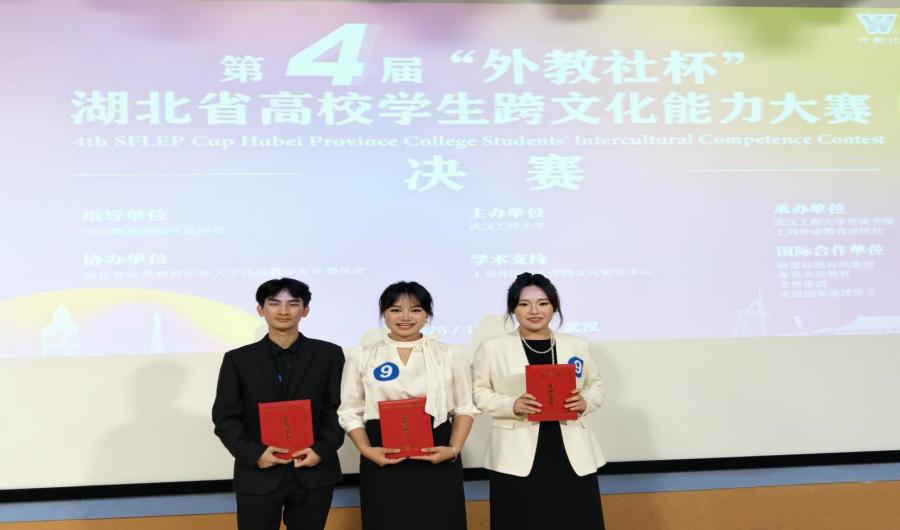 本网消息 10月18日,第四届“外教社杯”湖北省高校学生跨文化能力大赛决赛在武汉工程大学落下帷幕。来自Beat365官网外国语学院、新材料与绿色化工学院、经济与管理学院的方彤、吴郦雯、何运三位同学组成的参赛团队凭借出色的跨文化交际能力与扎实的英语应用水平,勇夺省级一等奖。这是Beat365官网首次在该项赛事中晋级决赛并斩获最高奖项,标志着Beat365官网在跨文化人才培养方面取得重要突破。