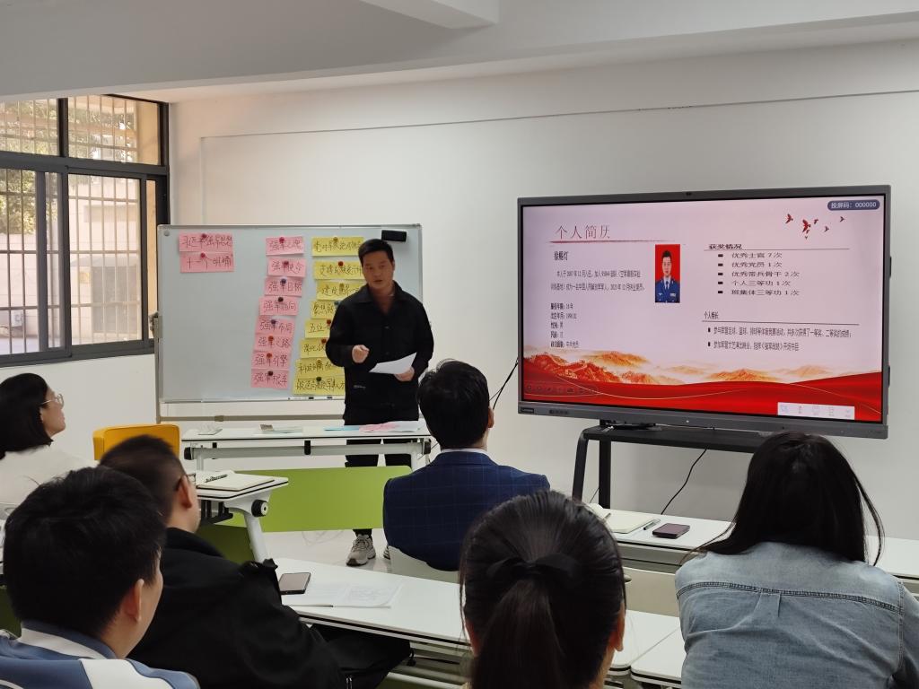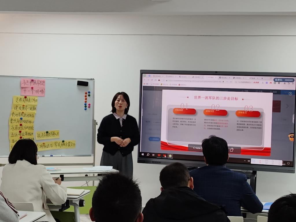 军事理论课程负责人胡敏讲述了课程教学要求,并开展《解读习近平强军思想“十一个明确”》示范课教学展示。她围绕新时代建设一支什么样的强大人民军队、怎样建设强大人民军队”等教学重点难点进行了深入剖析,并就如何将最新的军事动态、国防科技成果融入课堂教学,激发学生学习兴趣进行了分享。