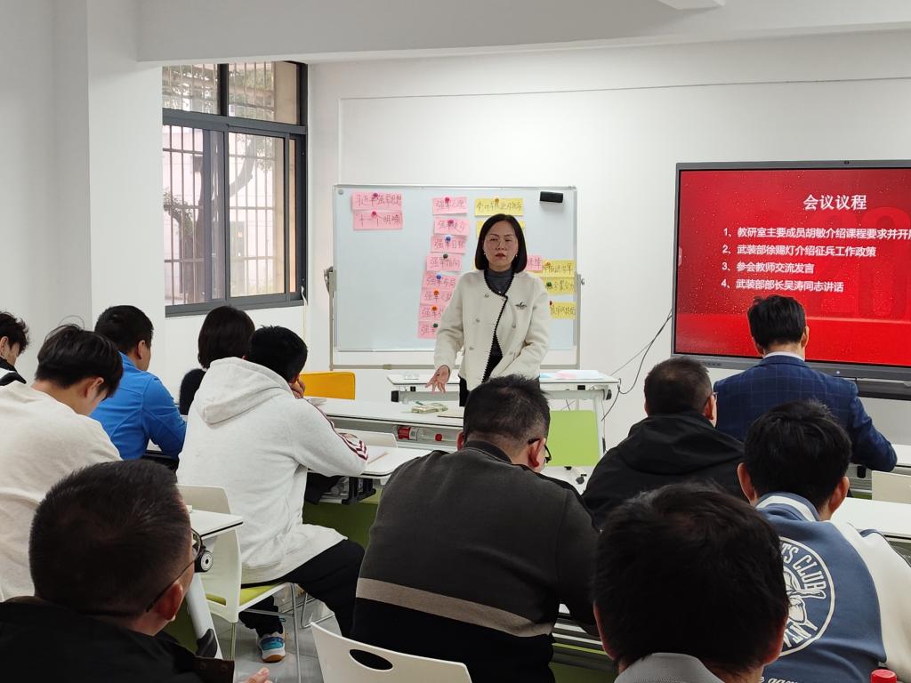 马军军就本学期军事理论课的任课教师选拔、核心知识点讲授、共享教学资源库建设等具体工作进行了部署和安排。明确了要进一步加强教学研究,推动信息技术与军事理论教学深度融合,努力把军事理论课打造成深受学生喜爱的“金课”。