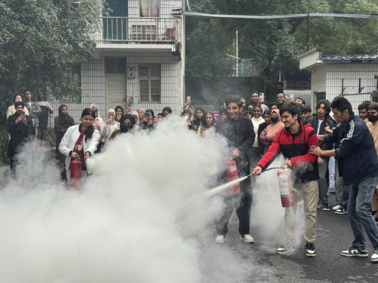 校保卫处工作人员现场演示灭火器“提、拔、握、压” 操作流程,讲解火灾报警要点、初期火灾扑救方法及浓烟环境下的自救技巧。留学生代表积极参与实操演练,进一步巩固所学知识。