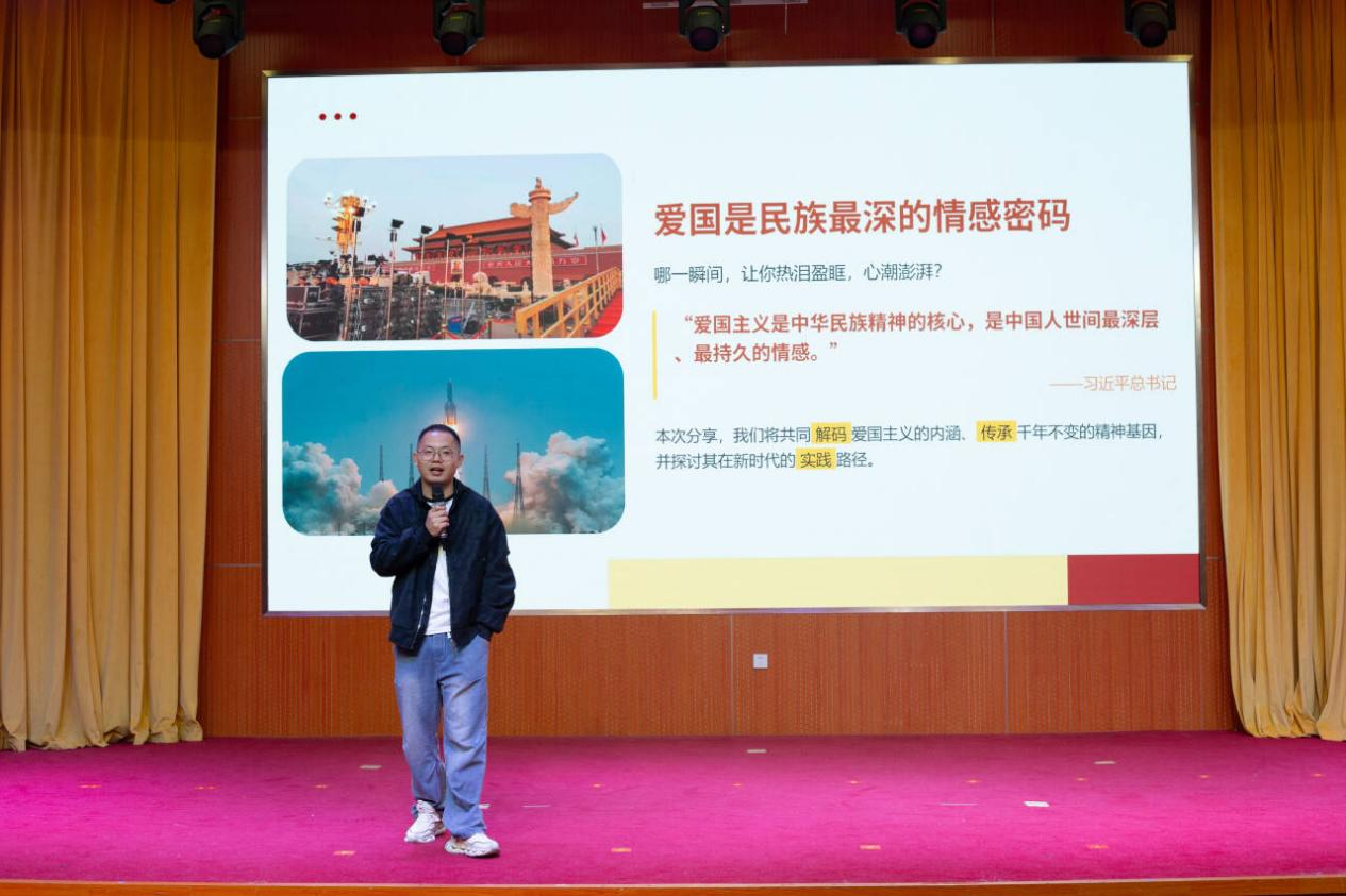 会议开篇,主讲人张毅以共鸣式提问引发思考,引用习近平总书记重要论述,解码爱国“四维内涵”,并结合千年爱国传承脉络,从古代家国同构思想到现代复兴接力奋斗,让学子深刻感知爱国精神的历久弥新。