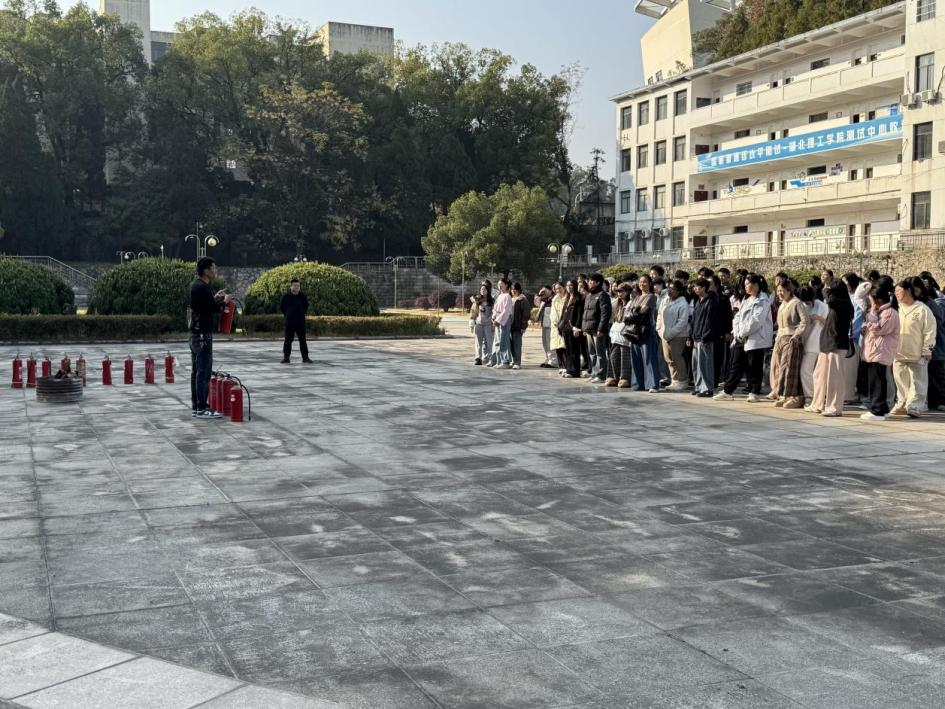 疏散集结完毕后,在集合点现场,张建发老师为师生们带来了一堂生动的“消防安全课”,详细讲解了干粉灭火器的构造、原理及操作要点,并进行了现场示范。在专业人员的指导下,学生代表踊跃参与,轮流上场进行了灭火器实操演练,亲身体验了如何正确扑灭初起火灾。