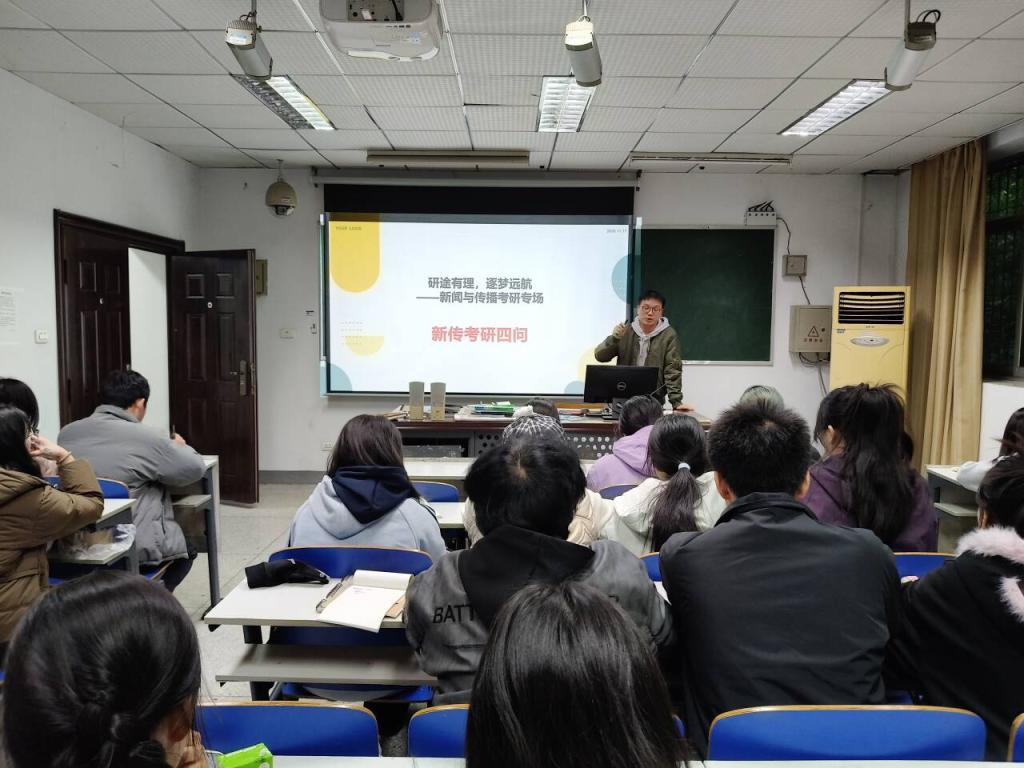 11月17日,新闻传播学考研专场讲座面向大一大二学生开讲。陈旭光博士介绍了该学科部分研招点概况与录取数据,梳理和总结了学院历届“上岸”学子经验,并围绕“如何择校”“是否跨考”“怎样准备”三个方面进行详细阐释。他重点强调了“自身实力、录取比例和发展目标”对于考研择校的重要性,引导学生理性选择。针对长线备考,他建议大一大二学生注重基础知识积累与核心能力训练,为考研筑牢根基。互动环节中,正在备考的2023级网媒学子刘同学分享了自己在老师的指导下,筛选、推翻、重审、锚定的择校过程和具体的考研规划,参考性强。同学们踊跃提问,内容涉及技能积累与学业平衡,陈博士逐一给予解答。