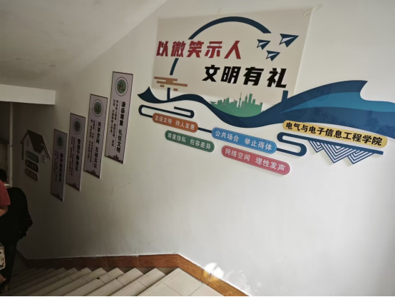 本网消息 近日,电气与电子信息工程学院宿舍楼梯间的文化墙正式亮相。原本简洁的墙面蜕变为集文明引导、学风培育、安全提醒于一体的“立体育人空间”,让“上下楼梯”的碎片化时光化作沉浸式育人课堂,让学生在日常通行中潜移默化接受文化浸润、涵养良好习惯。