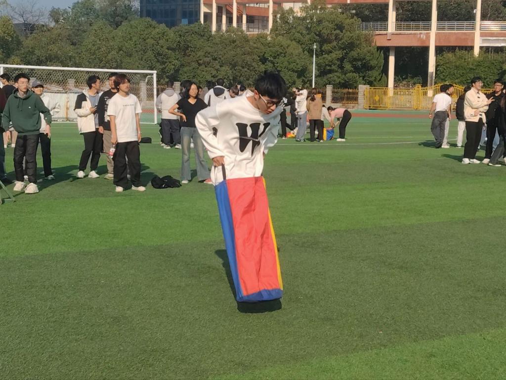 接下来的“袋鼠跳”环节,化作一片欢乐的海洋。同学们套上五彩布袋,化身为奋力跳跃的“小袋鼠”,有的身手敏捷,一马当先,有的憨态可掬,引得师生笑声连连。辅导员们更是化身“场外指导”,激动地指挥呐喊,师生情谊在轻松互动中迅速升温。