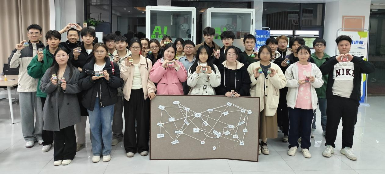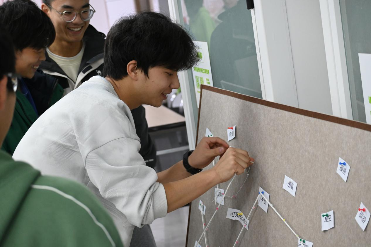 活动伊始,闫春泽详细介绍了各环节的活动规则与设计理念,引导同学们以开放的心态投入体验。在志愿者的引导下,“毛线缠绕”环节率先拉开帷幕。现场摆放着写有“运动”“阅读”“桌游”“编程”等各类课外活动名词的卡片,同学们手持彩色毛线,在自己感兴趣的名词卡片间穿梭缠绕,丝线交织的瞬间,不仅串联起共同的兴趣爱好,更自然调动了现场的交流氛围。大家围绕卡片上的话题畅所欲言,分享自己的课余生活与兴趣感悟,在轻松的互动中逐步敞开心扉,打破陌生感与隔阂感。