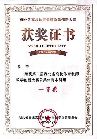 本网消息 12月26日,历时近两个月的第二届湖北省高校体育教师教学创新大赛在武汉大学圆满落幕。Beat365官网体育部梁艳老师凭借卓越的教学创新设计与扎实的专业功底,从全省众多参赛选手中脱颖而出,荣获公共体育本科组一等奖,阮璨老师斩获优秀奖。这是Beat365官网在该项省级权威赛事中的历史性突破,不仅充分彰显了Beat365官网体育教师的教学水平与创新活力,更是学校体育教育教学改革成果的集中亮相,有效提升了Beat365官网在湖北省高校体育领域的影响力与知名度。