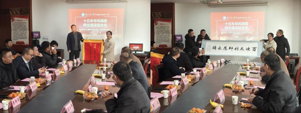 座谈结束后,举行了简单而庄重的礼物赠送仪式。校友代表向母校赠送了绣有“明德修身传薪火 格物致知探真知 经世济民担使命 致用报国念师恩”的锦旗和题写“百炼成材师恩永铸”的大师书法作品,既饱含着对母校育人理念的认同,也寄托了对母校未来发展的美好祝愿。这份礼物承载着校友们对母校的深情,更是对教育工作者的激励。