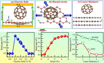 氧化锌薄膜材料因其潜在应用而被广泛关注。然而,其较大的带隙及对可见光低的利用率而阻碍其实际应用。本论文研究了在电场、应变以及薄膜厚度可调下C60与ZnO之间相互作用以及在外部因素干扰下对ZnO的电子结构、能带以及光催化的影响。研究结果表明:在平衡态时,C60/ZnO异质结可见光吸收率大幅度增加,并表现出典型的type-II能阶,有利于光催化分解水。其次,外加电场或应力或改变ZnO厚度可以调控其光吸收边,C60/ZnO异质结实现从半导体到金属特性的转变。而在外加电场作用下,C60/ZnO异质结从type-II向type-I能阶转变。因此通过有机-无机杂化设计方式形成C60/ZnO异质结结构有助于将氧化锌应用到光电器件或光催化水领域。