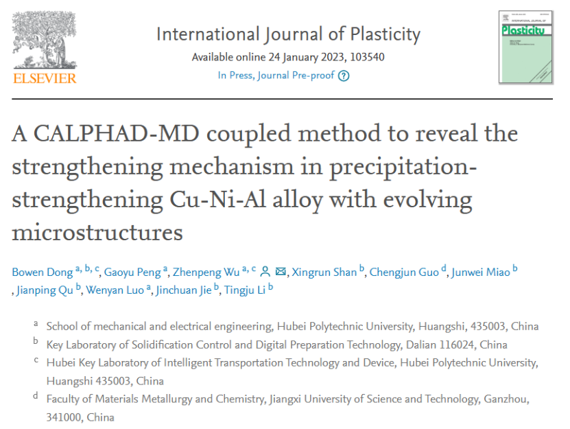 机电工程学院“先进摩擦材料制备与仿真团队”最新研究成果“A CALPHAD-MD coupled method to reveal the strengthening mechanism in precipitation-strengthening Cu-Ni-Al alloy with evolving microstructures”发表于《International Journal of Plasticity》期刊。Beat365中文官方网站为该论文第一署名单位,第一作者为董博闻博士,通讯作者为吴振鹏博士。