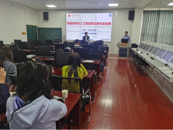 严怀成教授以“智能控制与人工智能前沿研究及应用”为主题做学术讲座,他介绍了智能控制和人工智能的最新研究进展,重点分享了其在无人车、机器人、大数据分析处理方面的相关实际应用成果。