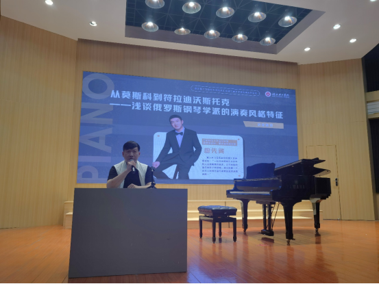当日下午,廖先冀老师以“从莫斯科到符拉迪沃斯托克——浅谈俄罗斯钢琴学派的演奏风格特征”为主题,为艺术学院的师生带来了一场精彩的学术讲座。廖先冀老师用简洁易懂的方式概括了“俄派”四位大师涅高兹、伊古姆诺夫、戈登维泽、费因伯格的钢琴演奏特点以及对演奏的思考,并亲自用俄派演奏方式为全体师生示范演奏柴可夫斯基第一钢琴协奏曲的片段。