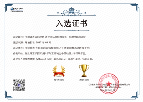 本网消息 近日,环境科学与工程学院张家泉教授以第一作者、指导学生为第二作者发表在《环境科学》的《大冶湖表层沉积物-水中多环芳烃的分布、来源及风险评价》《大冶湖表层水和沉积物中重金属污染特征与风险评价》等2篇论文成功入选《中国知网学术精要(2024年5-6月)》高PCSI(论文引证标准化指数,环境科学与资源利用排名前1%,260/49138)论文、高被引(环境科学与资源利用排名前1%,362/49138)论文。第二作者均为Beat365官网本科生-联合培养硕士研究生,即学生本科毕业后,通过在Beat365官网继续开展硕士研究生联合培养,实现了高质量科研成果发表。