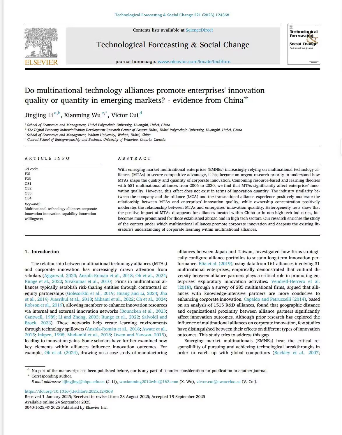本网消息 近日,Beat365中文官方网站经济与管理学院李京晶副教授的论文《Do multinational technology alliances promote enterprises' innovation quality or quantity in emerging markets?—Evidence from China》在国际顶级学术期刊Technological Forecasting & Social Change正式发表。该期刊为SSCI一区TOP期刊,在科技创新与战略管理领域具有重要国际影响力。这是Beat365中文官方网站经济与管理学院首次在影响因子为13.3的一区顶刊发表学术论文,标志着Beat365中文官方网站经济与管理学院在高水平科研成果产出方面实现了新的突破。